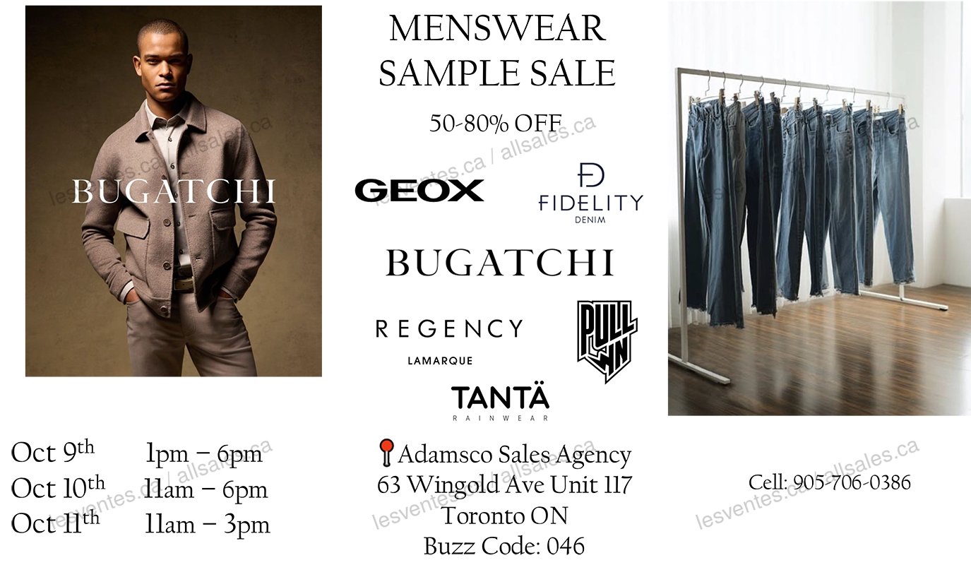 Adamsco Sales Agency sale from October 9 to 11 in Toronto. Geox, Fidelity Denim, Bugatchi, Regency by Lamarque, Tanta Rainwear, Pull In. Clothing, denim, and more.