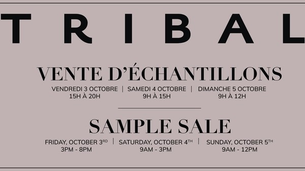 Tribal sample sale, October 3rd to 5th, 2025. Tops and bottoms at $10, dresses & vests at $15, jackets & shackets at $20. Sizes available: XXS - XXL. Cash only.