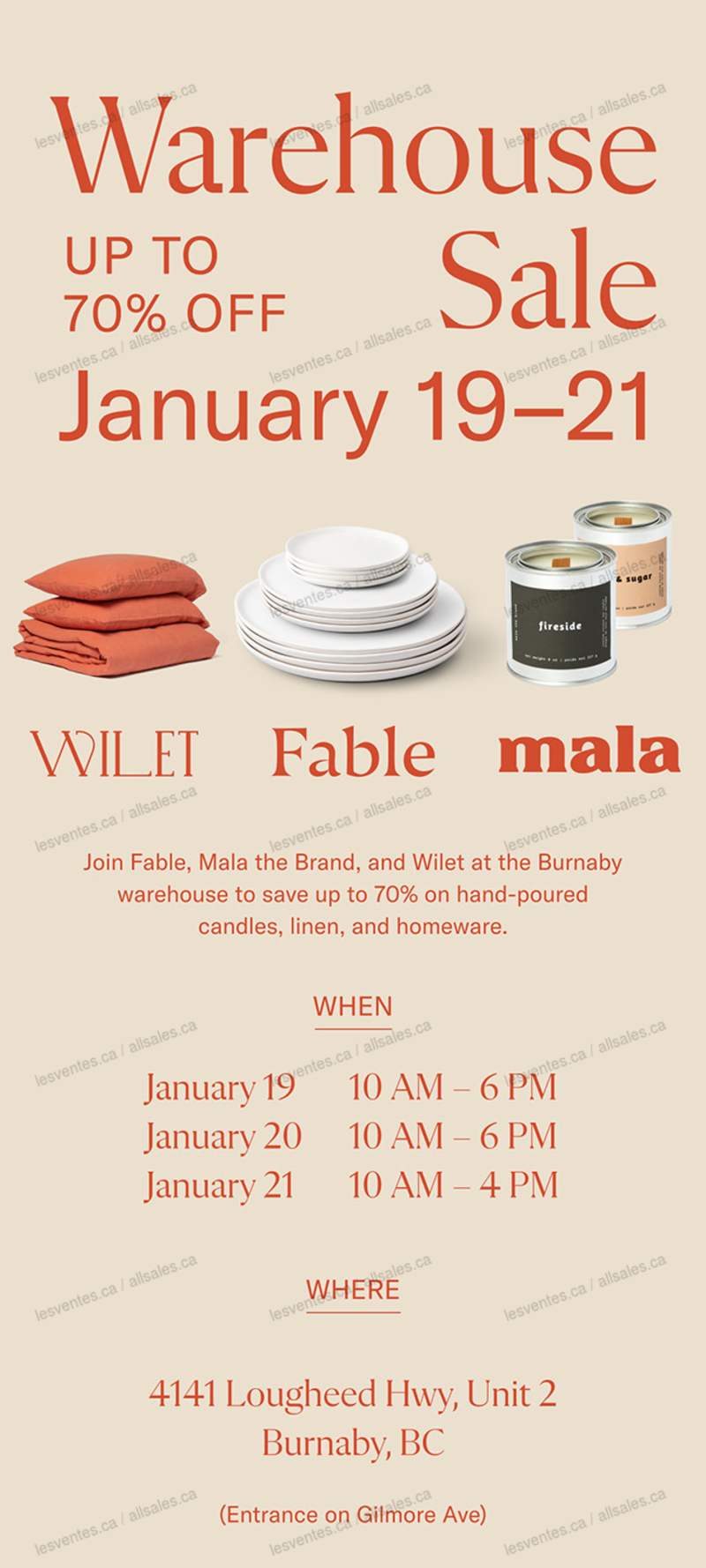 Join Fable, Mala the Brand and Wilet at the Burnaby warehouse to save up to 70% on hand-poured candles, linen and homeare. You know we really love local, and this is a sale not to be missed. This weekend only, January 19 to 21, 2024.