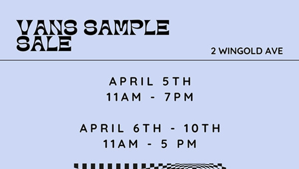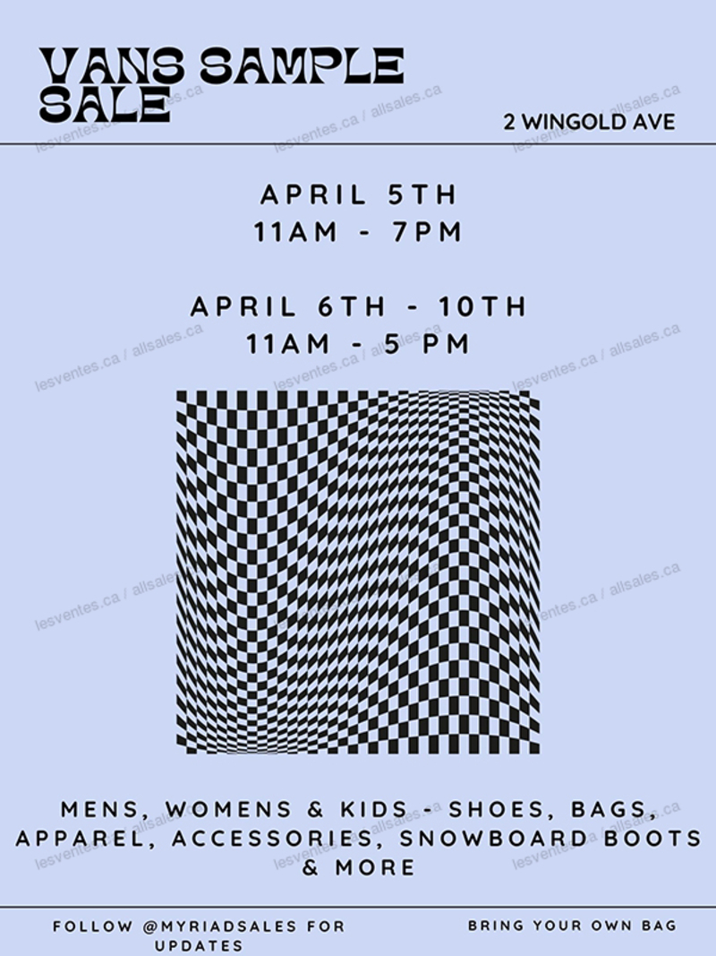 VANS sample sale in Toronto until April 10! Hurry! For women, men and children. Shoes, bags, apparel, accessories, snowboard boots and more.