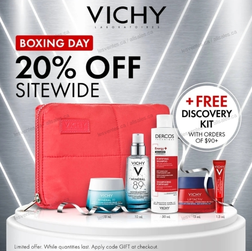 Discovery Kit: Minéral 89 Booster (10 mL), Liftactiv Collagen Specialist 16 Eye Cream (1.5 mL), Dercos Energy+ Shampoo (50 mL), Minéral 89 72h Moisture Boosting Rich Cream (15 mL), Liftactiv B3 Tone Correcting Night Cream (15 mL) and a Red Pouch.