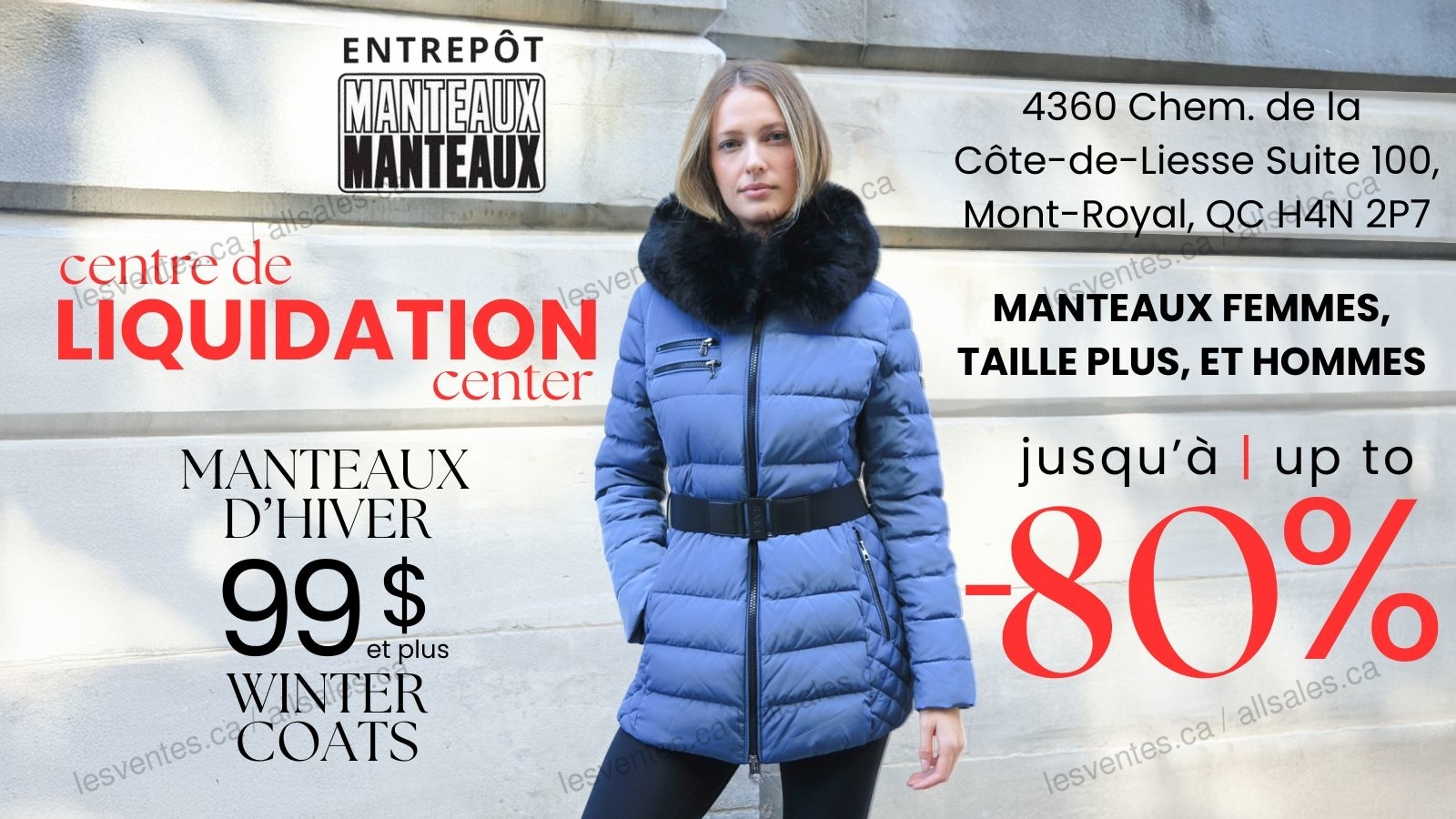Get up to 80% off coats at the Manteaux Manteaux warehouse sale. Winter coats on liquidation starting at 99$, clothing 70% off, and styles from brands Point Zero, Sicily, Saki, Sokos & Oxygen. Shop discounts for women, including plus sizes, and men.