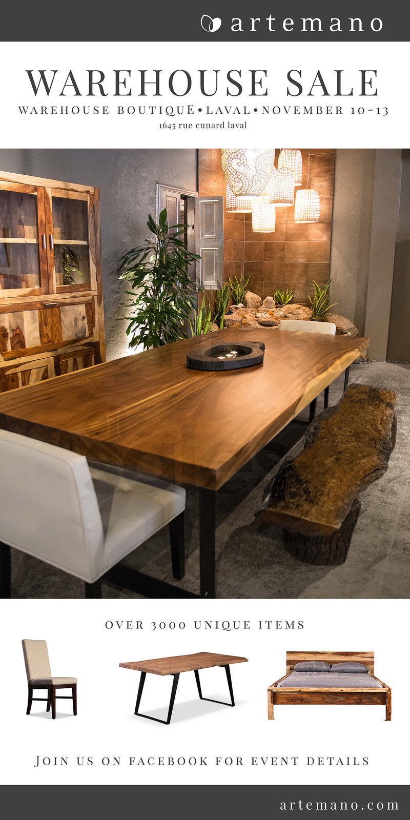 Artemano's warehouse sale in Laval will be taking place Thursday, November 10 until Sunday, November 13. Discover our wide variety of treasures in search of a new home : beds, dining and coffee tables, TV units, night tables, stools, vases...