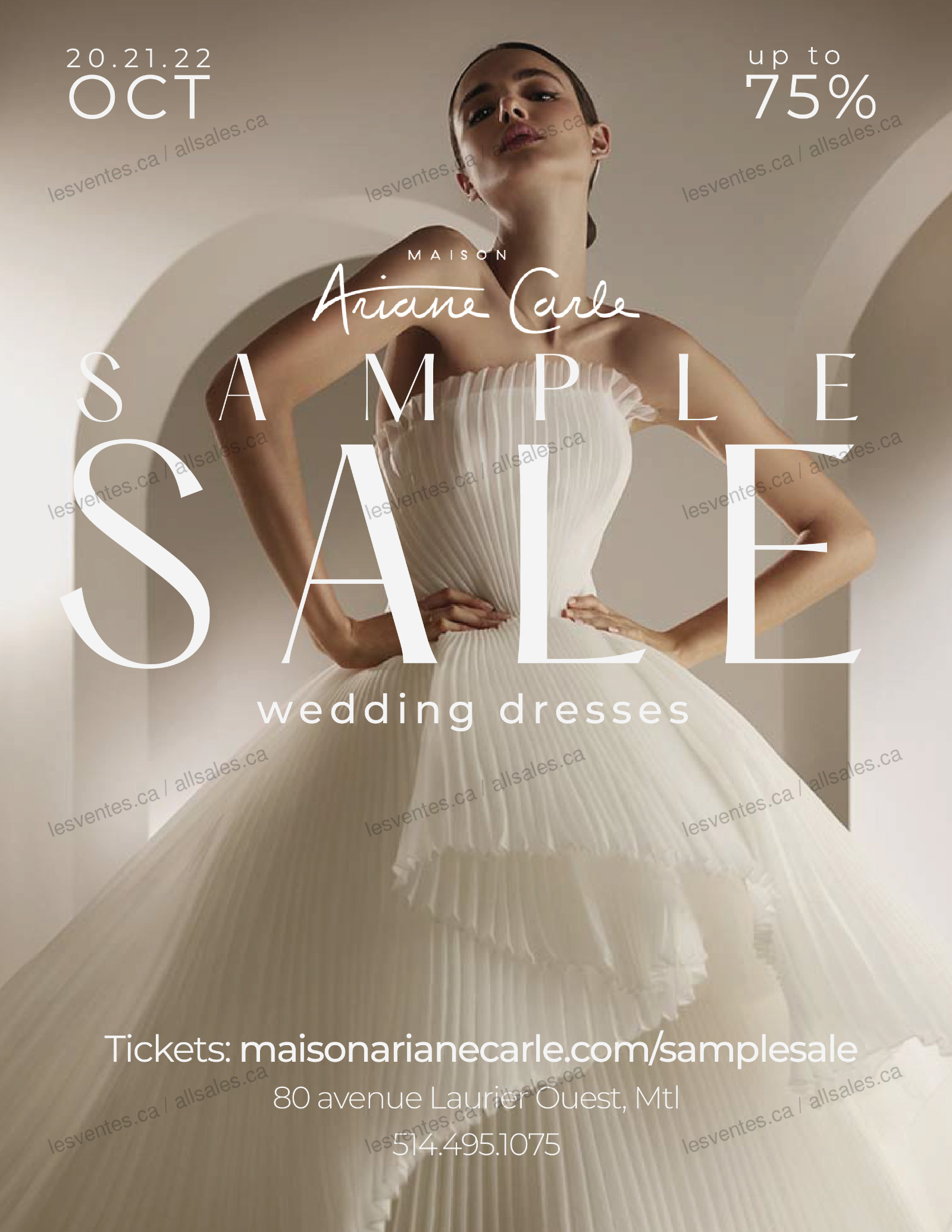 Up to 75% off - 3 days only! From October 20th to 22nd. A large selection of wedding dress samples from different designers’ collections such as Pronovias, Mikaella, Justin Alexander and Paloma Blanca.
