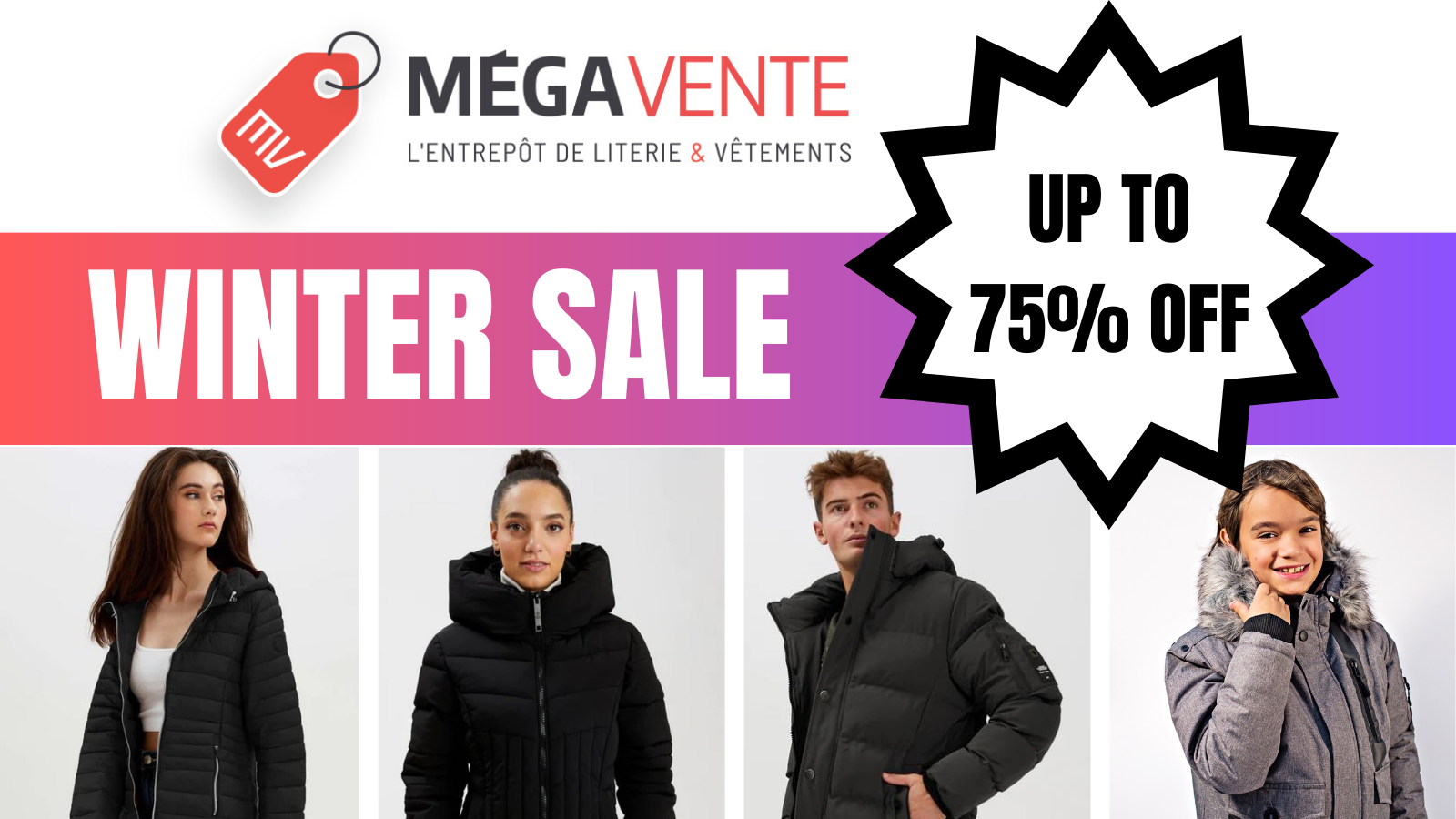 Big winter sale at Méga vente! Kids snowsuits from well-known brands (12 months to 16 years) starting at $69! Men's and women's coats from $69: Point Zero, Toboggan, Diamond Trail, Tylor Zane Collection, Exploration and more.