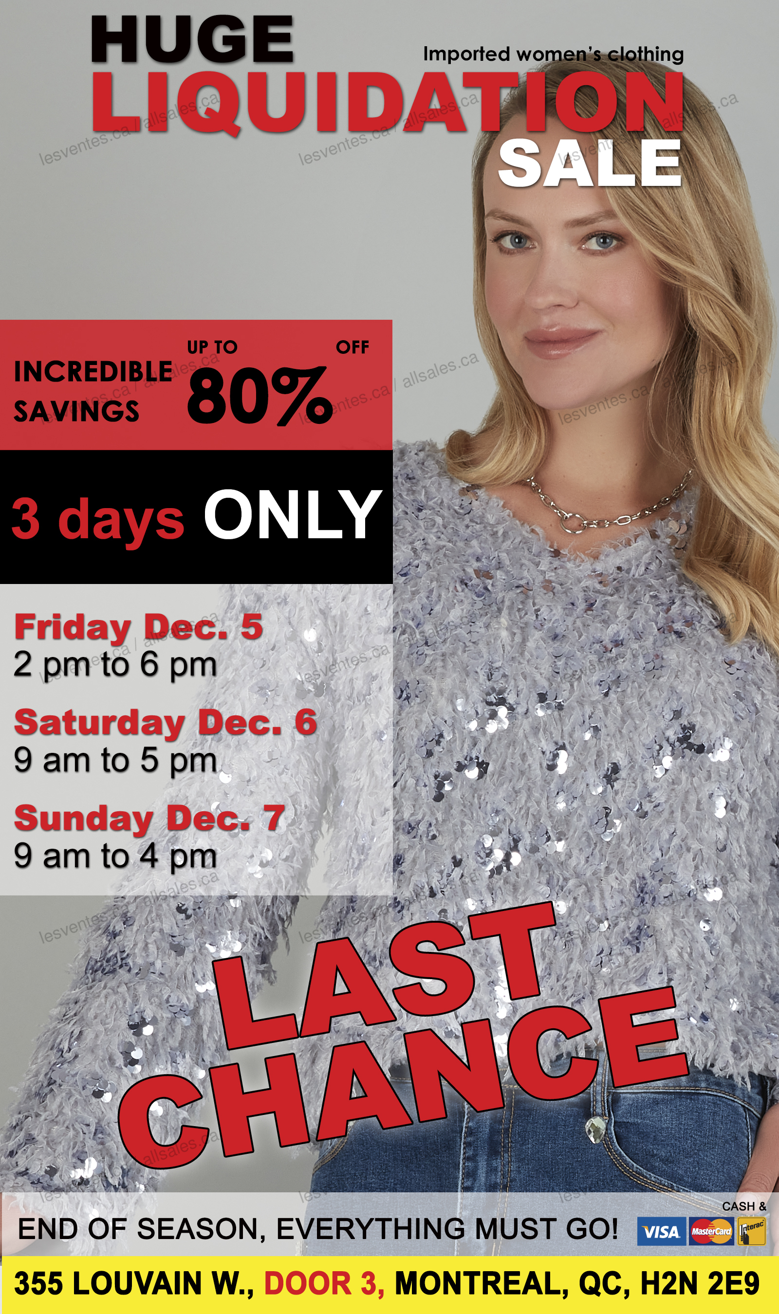 Imported women's clothing huge liquidation sale, 3 days only on December 5-6-7, 2025. Save big with incredible prices, up to 80% off well-known fashion brands. End of season, everything must go!