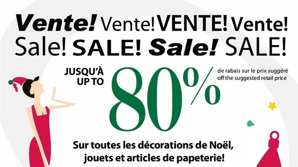 Great sale on Christmas decorations - one day only - November 27th: toys, paper goods, candles, tables decorations, gift wrap, Christmas cards, crackers & more. This is your chance to stock up on Christmas items at 80% off the suggested retail price. More