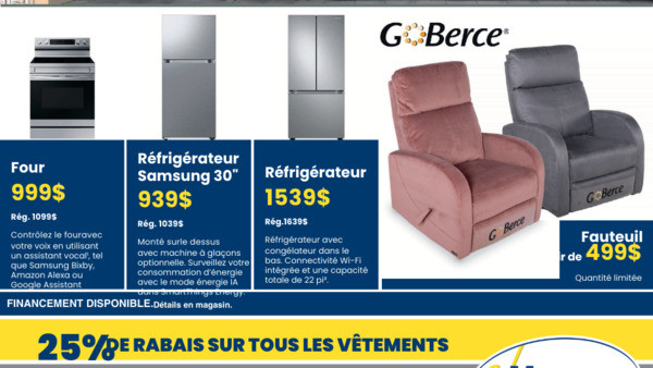 At Meubles & Davantage, enjoy surplus from major chains at 30% to 50% less! Furniture, appliances, clothing, sports gear, food and more. Regular new arrivals. First come, first served! Come save more! More