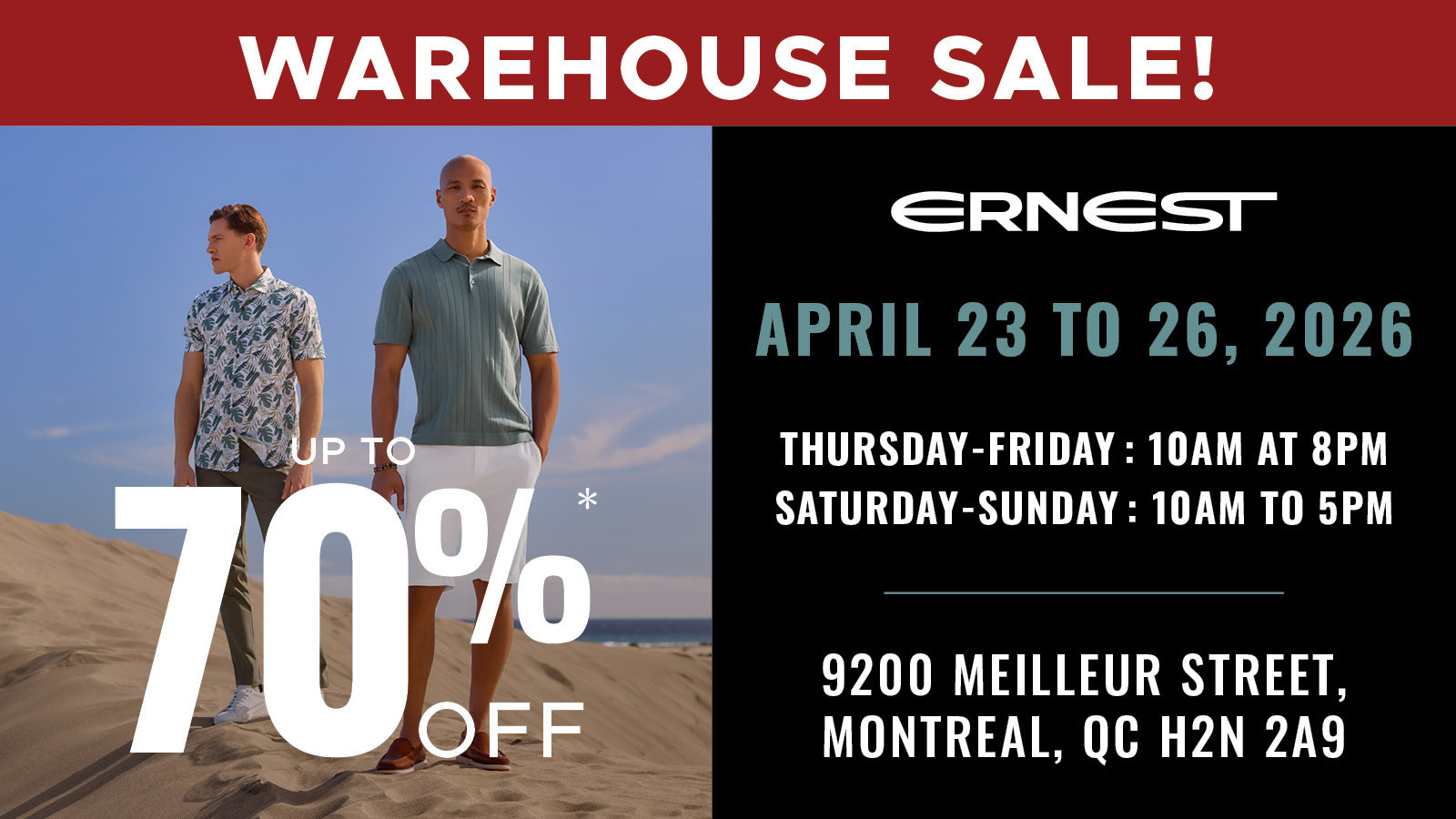 The Ernest Warehouse Sale is back from April 23rd to 26th, 2026. Up to 70% off shirts, t-shirts, polos, suits, jackets, jeans, and more! Puma, Au Noir, Bugatchi, 34 Heritage, Mavi, Florsheim, Robert Barakett, Robert Graham. More