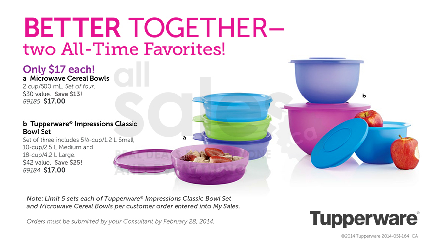 Tupperware deal of the week! Save up to 59% on bowl sets! Get 4 microwave cereal bowls for $17 and 3 Impressions Classic bowls for $17. Valid until February 28th.
