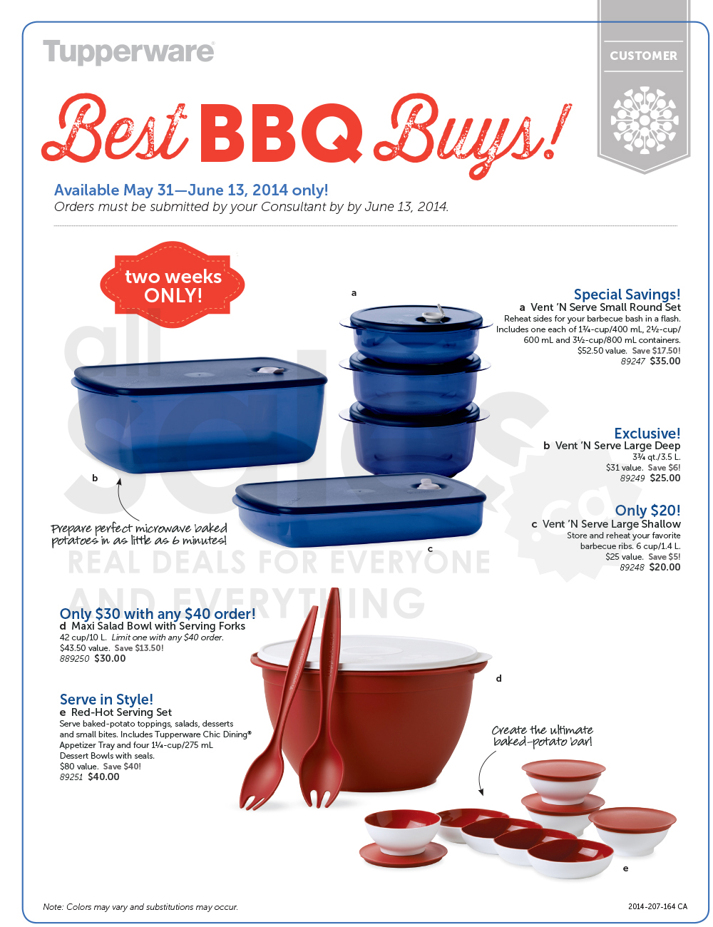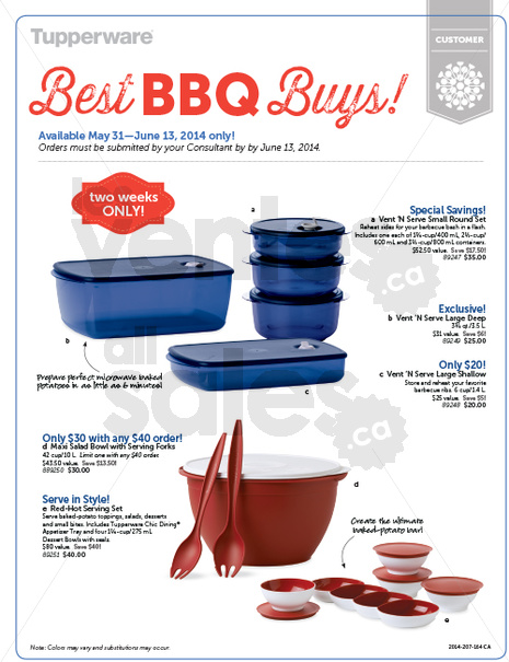 Until June 13th, save big on Vent 'N Serve sets! Get the small round set for $35, the large deep for $25 and the large shallow for only $20. With any $40 order the Maxi Salad Bowl with serving forks is only $30!