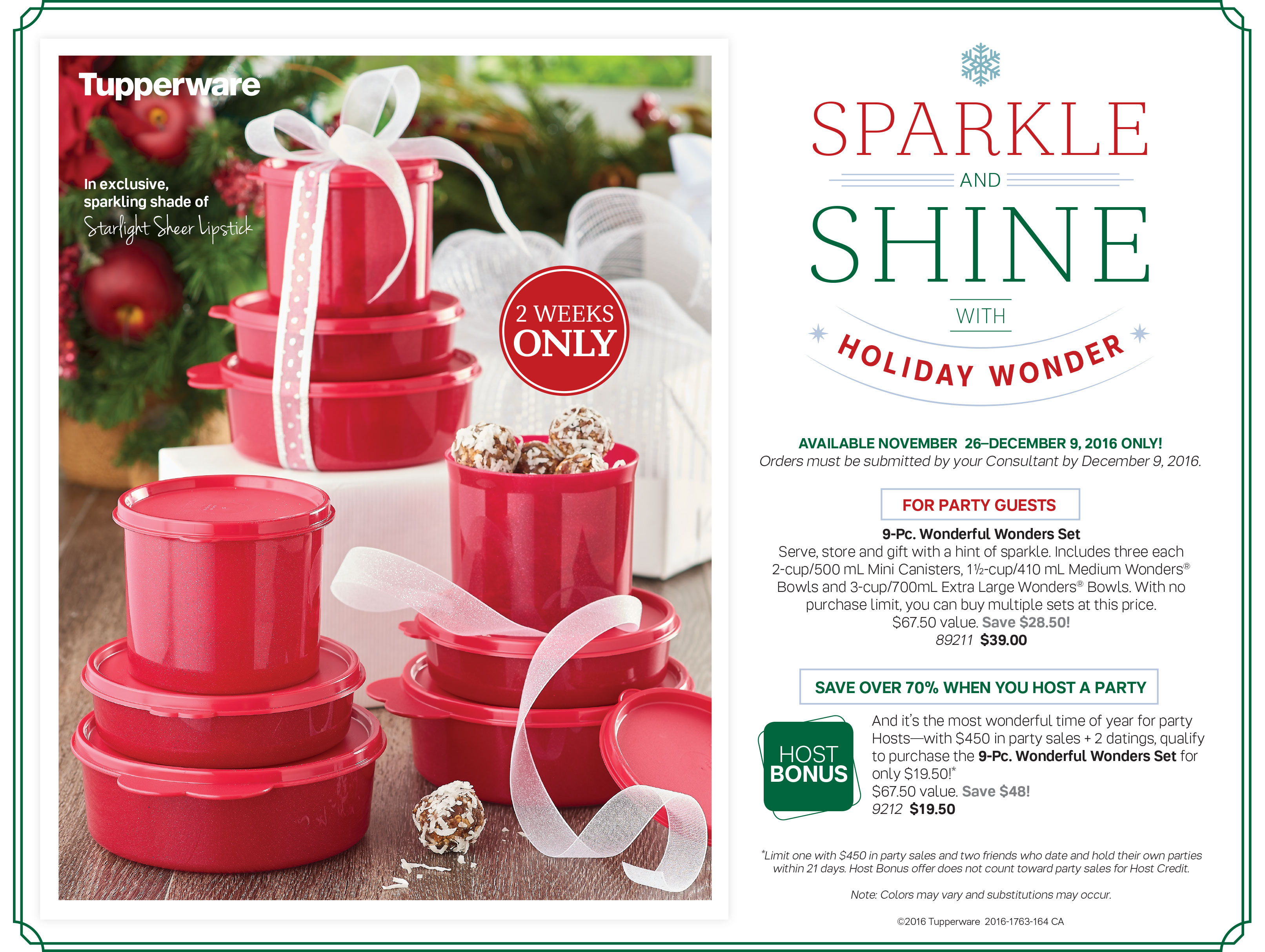 Until December 9th, take advantage of the "Sparkle & Shine" Tupperware promotion! As a party guest, you'll be able to buy the 9 pc wonderful wonders set at only $39 (reg. $67.50). As a host, if you qualify*, you will only pay $19.50!