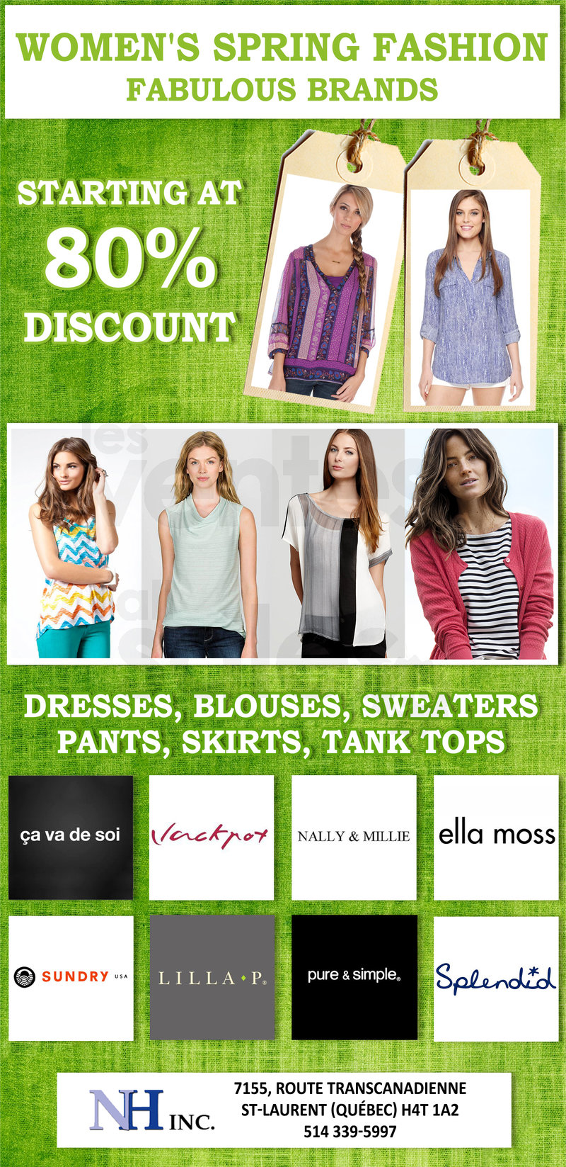 Discover Spring fashion for women at NH Inc with discounts starting at 80% on all items! We have fabulous brands such as: Jackpot, ça va de soi, Ella Moss, Sundry, Lilla P, Splendid, Pure & Simple... Hurry for best selection. While quantities last!