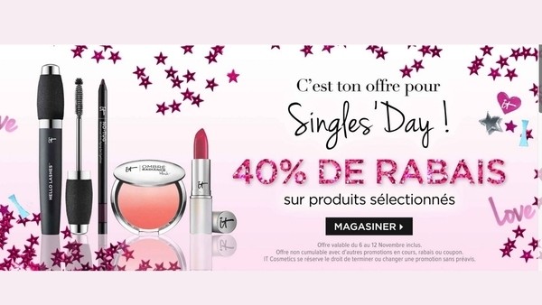 Single's Day Promotion! Save 40% off selected products online IT Cosmetics Canada. No code necessary. Free shipping.