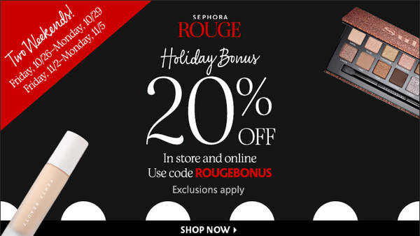 Sephora Rouge Members, treat yourself with 20% off your favorite Sephora products during this year's exclusive Holiday Bonus Beauty Insider Event!