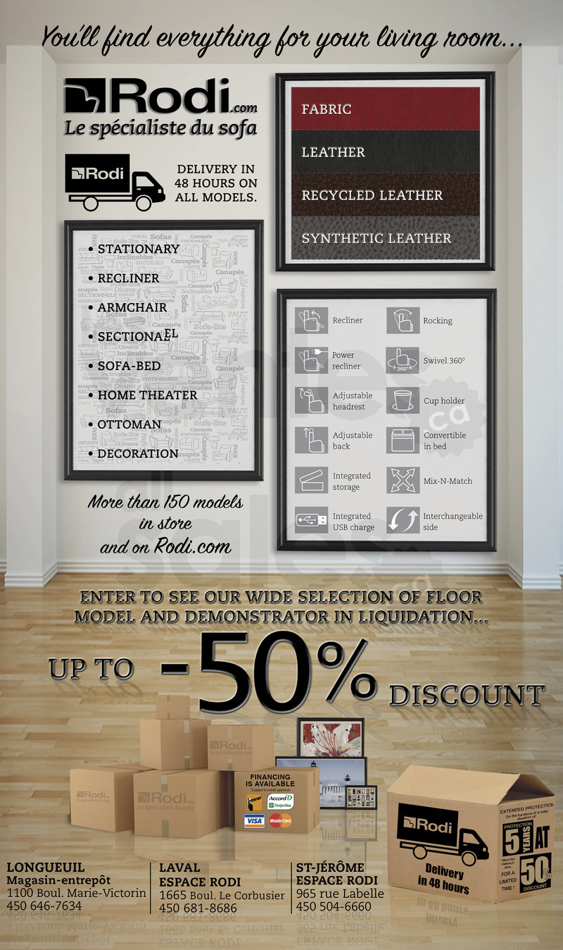 Looking for the living room of your dreams, but you're on a budget? Rodi, the sofa specialist in Longueuil, is the perfect place! Save up to 50% on selected models: inventory surplus, floor demos, film shooting returns... New items added every day!