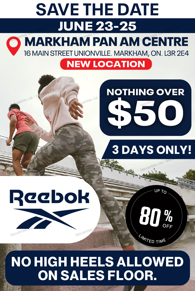 Shop Reebok's warehouse sale in Markham, June 23-25 and save up to 80%! Nothing is over $50.