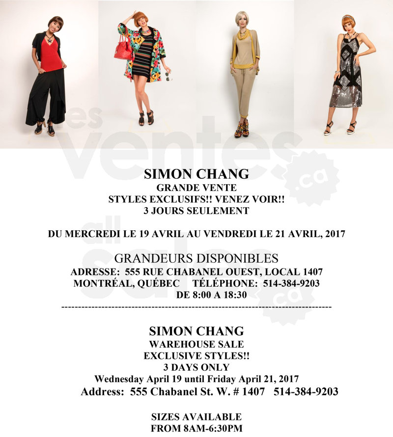 Simon Chang is having a huge sale only 3 days, on April 19-20-21 at their warehouse on Chabanel! All sizes will be available. Don't miss this unique opportunity!