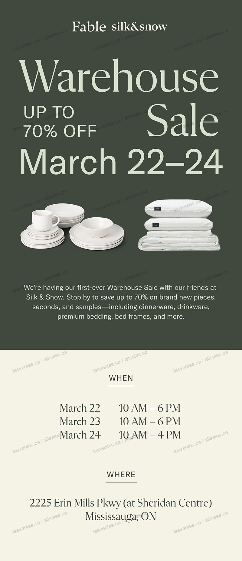 Fable is teaming up with Silk & Snow for their first ever warehouse sale in Toronto! Save up to 70% off on brand new pieces, seconds and samples - including dinnerware, drinkware, premium bedding, bedframes and more!