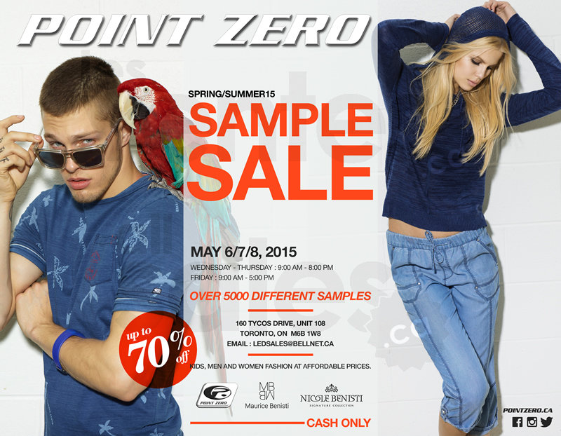 Point Zero spring/summer 2015 sample sale in Toronto will take place May 6 to 8. Save up to 70% off over 5,000 different samples! Kids, men and women fashion at affordable prices.