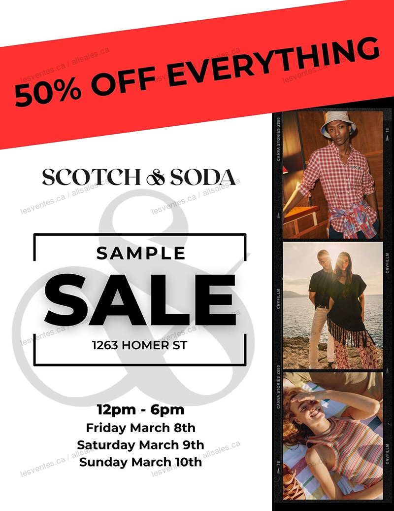 Scotch & Soda sample sale in Vancouver on March 8-9-10 from 12 pm. to 6 pm. 50% off a large selection of clothing for men and women.