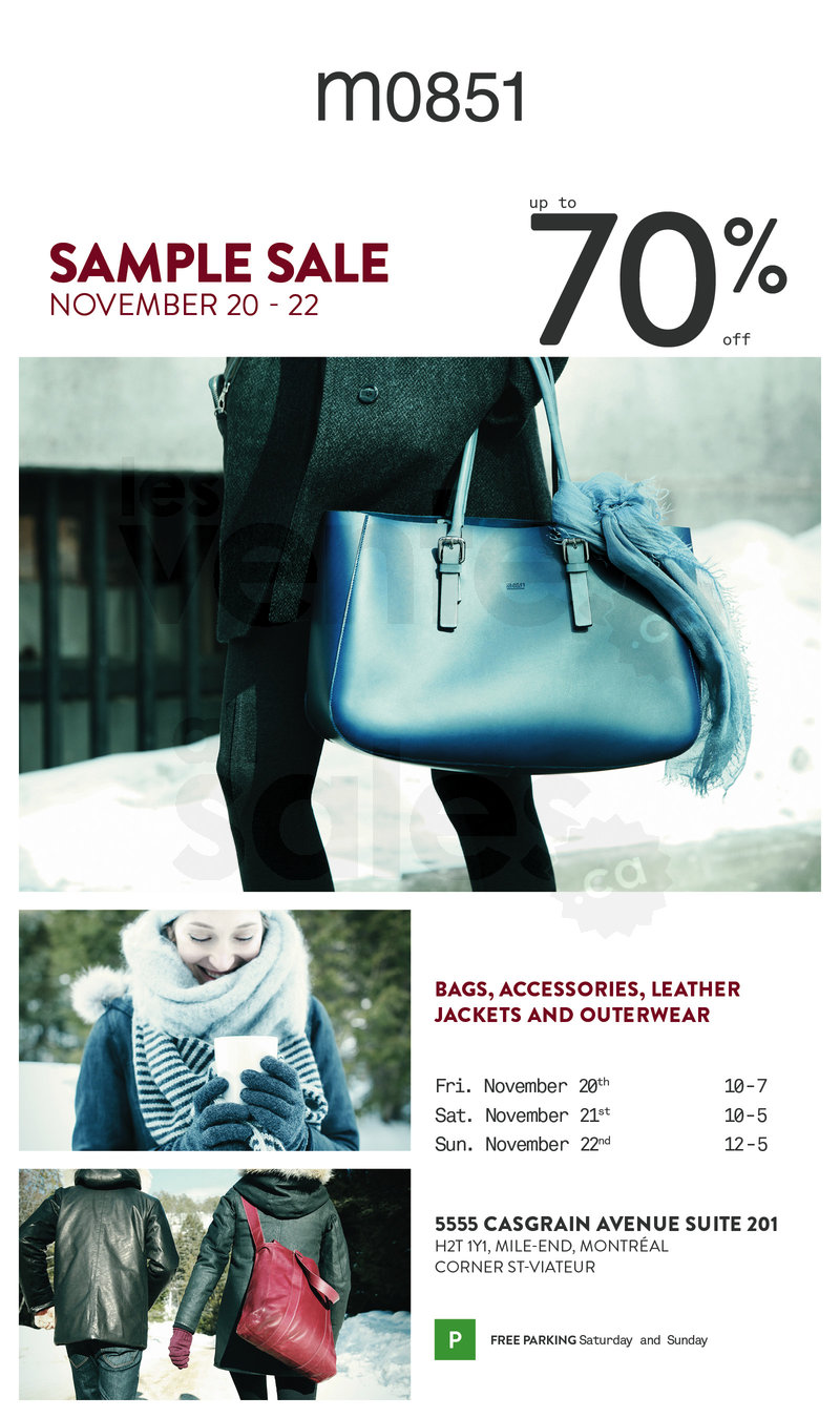 November 20th to 22nd, come see us at the m0851 clothing and accessories sample sale. Save up to 70% off on bags, accessories, leather jackets and outerwear.