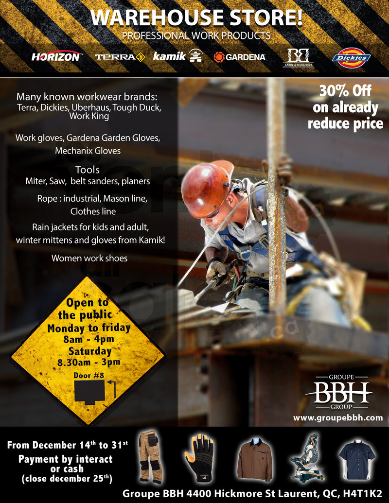 Warehouse sale of professional work products. Up to December 31, you will save 30% off on already reduced products: workwear, gloves, rain suits and Kamik mittens for kids, tools, rope, woman's work shoes. Terra, Dickies, Uberhaus, Work King & more.