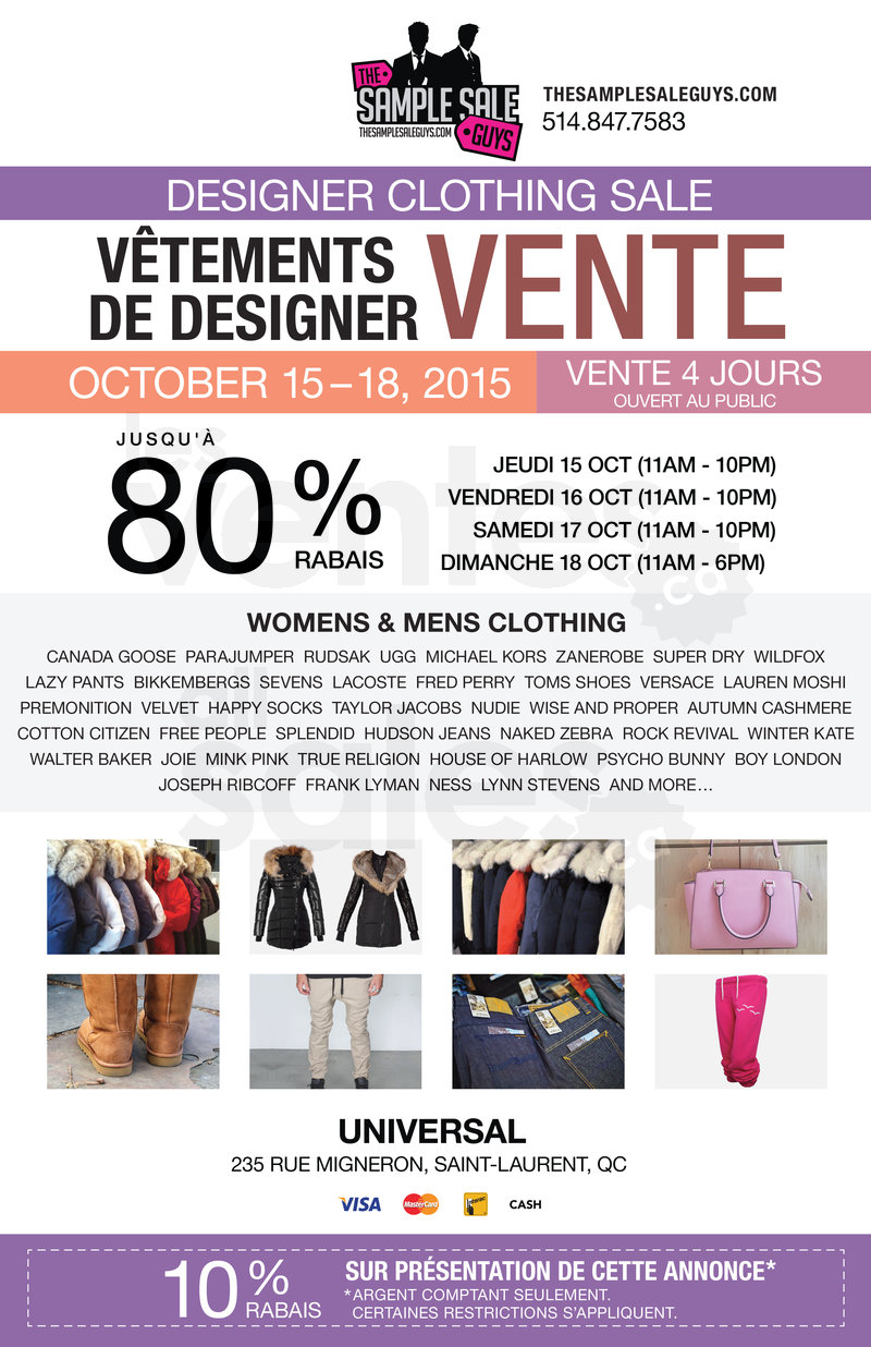 Huge designer clothing sale Oct. 15 to 18! Save up to 80% off women’s & men’s designer collections: Canada Goose, Parajumper, Michael Kors, Rudsak, UGG, Super Dry, Lacoste, Fred Perry, Versace, Rock Revival, Toms Shoes, True Religion & more.