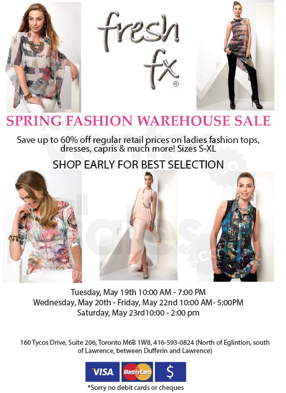 Fresh FX Spring fashion warehouse sale, May 19th to the 23rd. Save up to 60% off regular retail prices on ladies fashion tops, dresses, capris & much more! Sizes S-XL. Shop early for best selection!