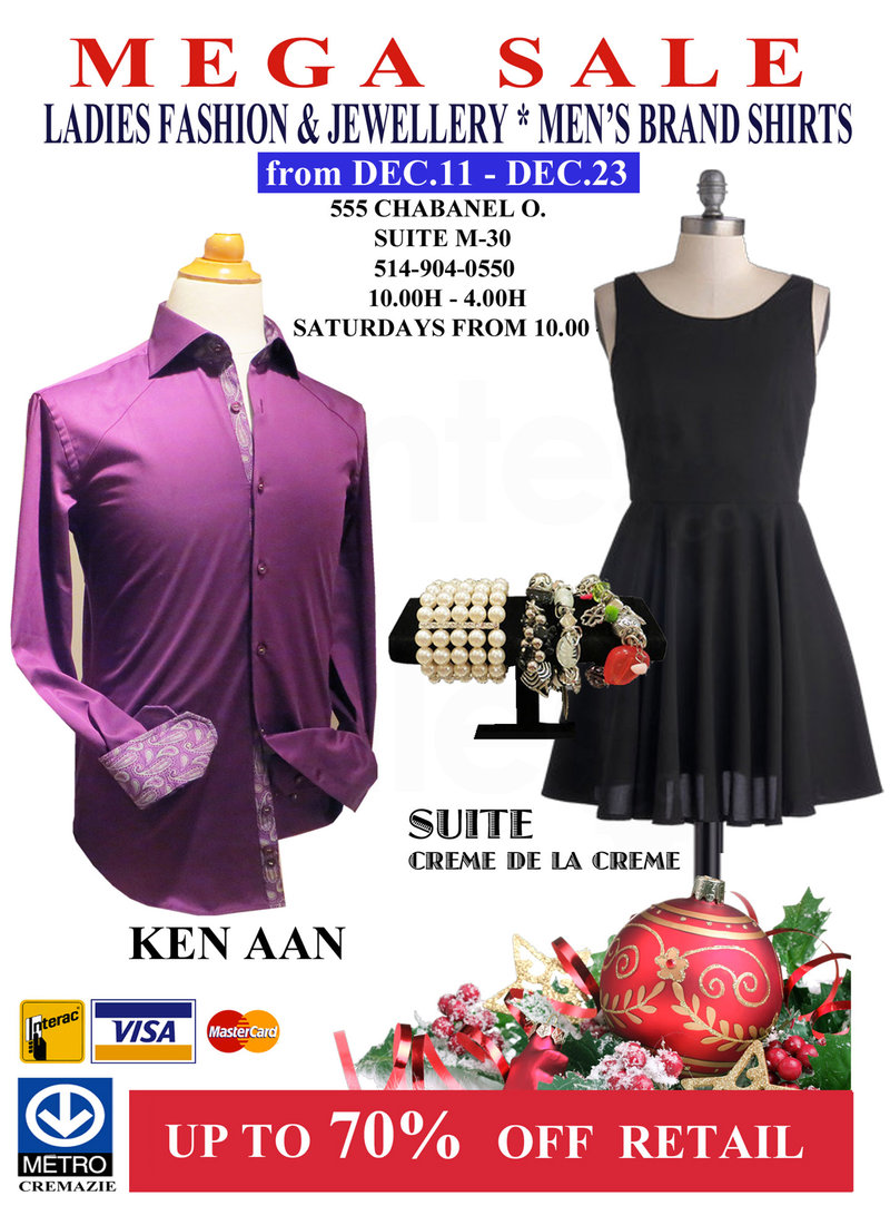Warehouse sale on top quality clothes and jewelry imported from Italy and Turkey for men and women. First come, first served! Enjoy discounts from 50% to 70%. Open Monday to Saturday.