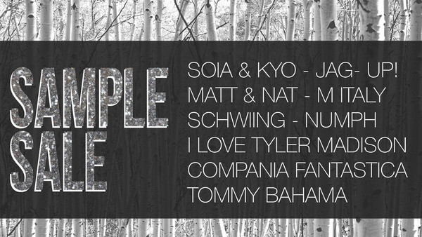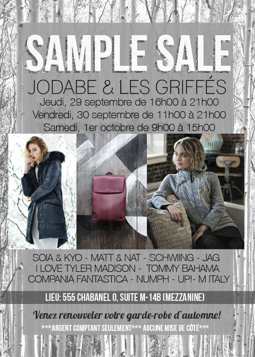 Sample sale by Jodabe & Les Griffés from September 29th to October 1st only. Save on women's clothing, coats and handbags from Soïa & Kyo, Matt & Nat, Schwiing, Jag, Tommy Bahama, I Love Tyler Madison, Compania Fantastica, Numps, Up! and M Italy.