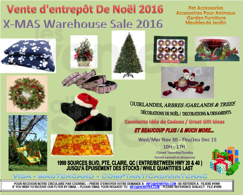 X-Mas warehouse sale, from November 30 to December 15. Be the first for a better choice of garlands, trees & much more at unbeatable prices! Also many gift ideas, pet accessories and garden furniture