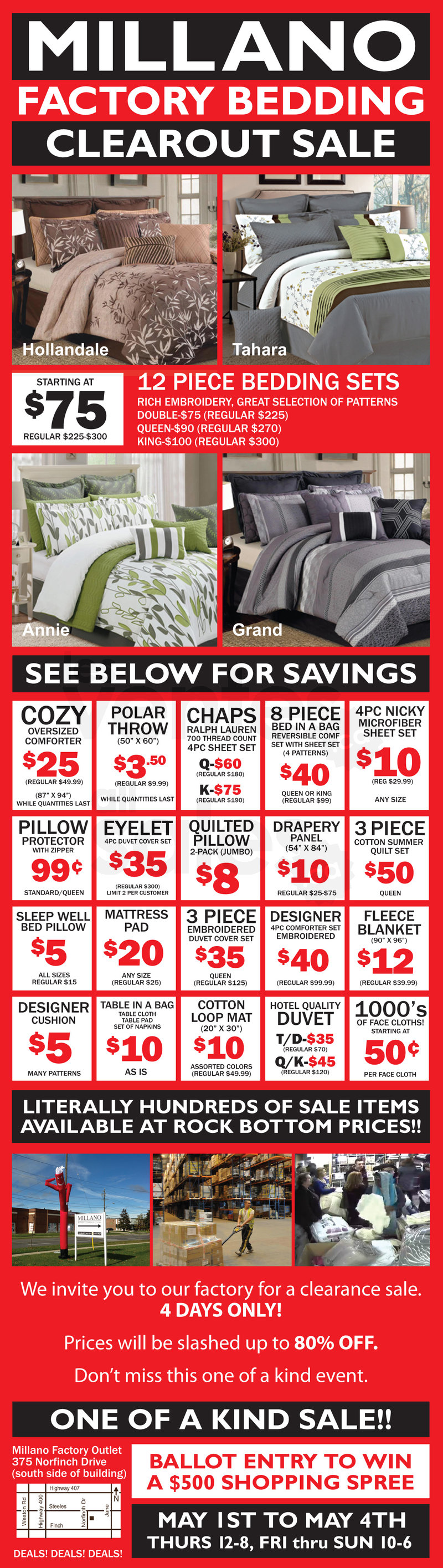 Millano Bedding Factory Clearance Sale with prices slashed up to 80% off. 4 DAYS ONLY! You will have exclusive access to hundreds of sale items not available to the public. Also, come in to fill out a ballot for a chance to win a $500 Shopping Spree.