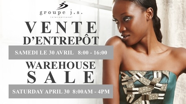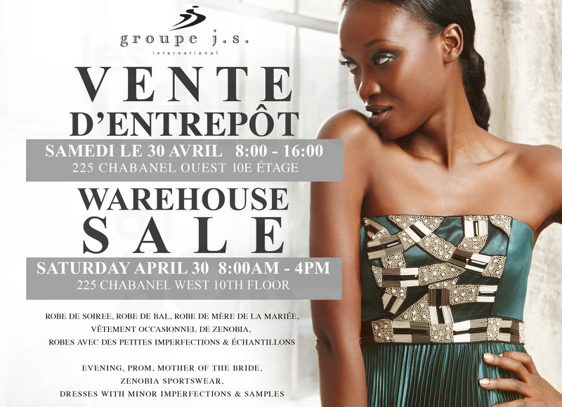Groupe JS International is having a warehouse sale on April 30th. Discover our trendy collections at incredible prices! High quality clothing ranging from casual wear to evening wear and prom to bridal. Wide selection of styles and sizes available.