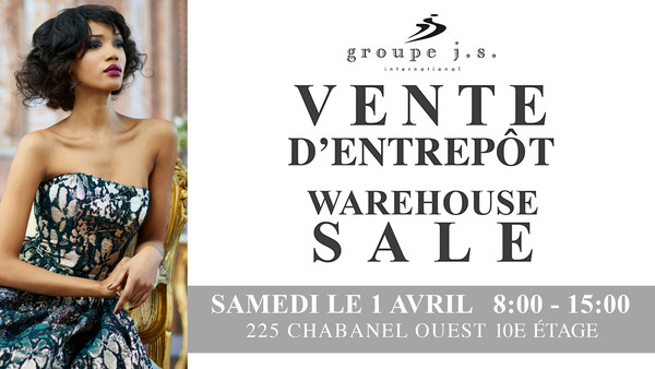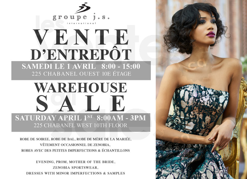 Groupe JS International is having a warehouse sale on Saturday April 1st. Designer designs at warehouse prices! High quality clothing ranging from casual wear to evening dresses, bridesmaid, mother of the bride. Large selection & sizes available.