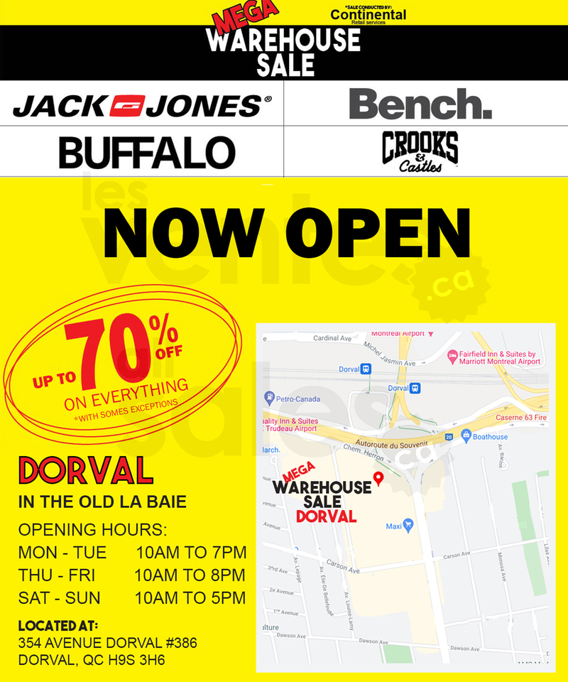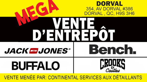 New store in Dorval! Mega warehouse sale Jack and Jones, Bench, Buffalo , Crooks and Castle and more. Open 7 days a week. Several items reduced at incredible prices! Up to 70% off. Come and see us!