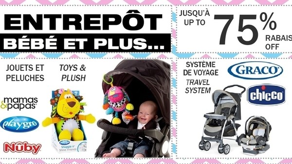 Now available at Méga Vente Entrepôt! 2016 baby products up to 75% discount! You will find items from well known brands: clothing to furniture, bedding, decoration, strollers, car seats, nappy bags, a variety of toys, accessories and more!